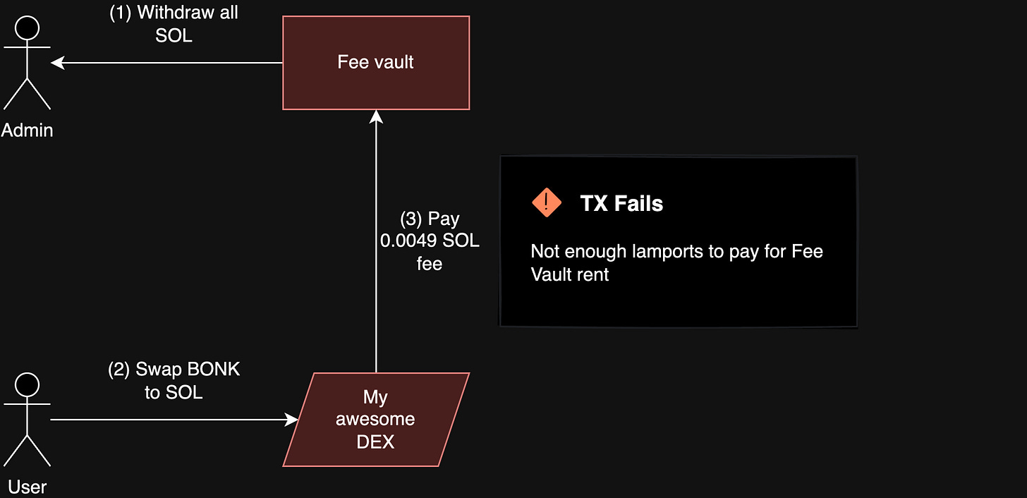 Minimum Lamports Issue: Imagine a protocol that uses native SOL to charge fees. During a swap transaction, the protocol needs to transfer a fee to a designated account. If the fee amount is less than the minimum lamports required for the transaction, the transfer will fail. This can happen if, for example, a user withdraws almost all the lamports from the fee receiver account. When the fee is calculated and it's less than the minimum required lamports, the transaction won't go through, causing a minor denial-of-service (DoS) issue. This happens because Solana requires all accounts to have enough lamports to cover rent. You can check this value using the Rent account function.
